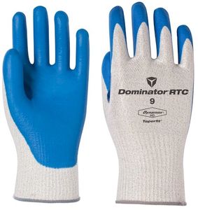 Dominator® RTC gloves offer the same protection as the regular Dominator® gloves but with the added benefit of a reinforced thumb crotch. These gloves provide liquid protection from non-hazardous chemicals in environments where cut resistance from machined parts or metal edges is required. This coating offers additional wear resistance without restricting flexibility. Dominator® RTC gloves are made with Dynamax® HD, a lightweight continuous filament yarn that works on a principle of ultra high tensile strength to prevent a metal edge from cutting into the fabric of the glove. Due to Banom's patented yarn construction, these gloves are extremely light weight and provide dexterity and tactile feel. Dominator® RTC gloves are 100% latex free and are treated with Sanifresh® to keep bacteria from growing both during and after glove use. The new Taperfit® knitwrist cuffs are extended length to protect the wrist area without causing tightness or discomfort. Due to their tacky grip, Dominator® RTC gloves are not recommended for use when turning nuts, bolts, or screws with a power tool as this can result in a “wrap-up”. Nitrile coatings can become slippery in water-based solutions. These gloves are made with a synthetic yarn, so they should not be used near heat or open flame. Dominator® RTC gloves should be edge-tested prior to approval for use